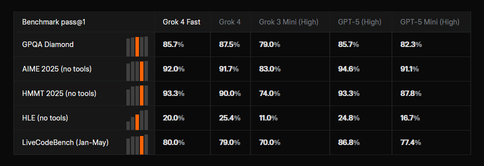 Below is a table summarizing the benchmark scores for 'Grok 4 Fast,' 'Grok 4,' 'Grok 3 Mini,' 'GPT-5 (High),' and 'GPT-5 Mini (High).' Grok 4 Fast performed better than Grok 4 in some tests and recorded scores equivalent to GPT-5 (High) in several tests.