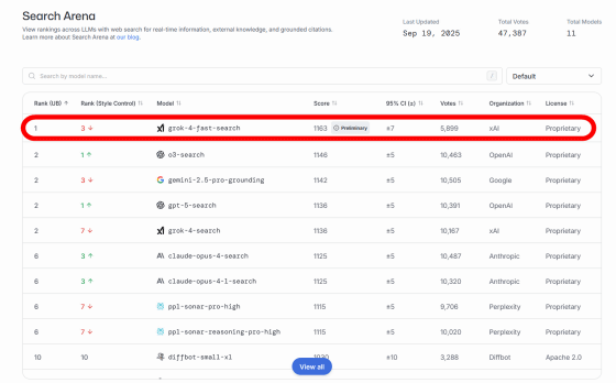 xAI, an AI company led by Elon Musk, announced the low-cost, high-performance AI model Grok 4 Fast on September 19, 2025. Grok 4 Fast is being promoted as a low-cost model with the same performance as Grok 4, and is rated as the best current model in terms of search performance, beating ChatGPT and Gemini. The beta version of Grok 4 Fast has also been released via X (formerly Twitter), making it easy for free users to use.
