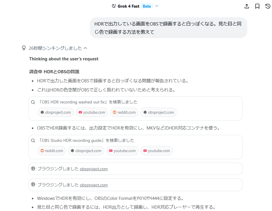 All you have to do is type your question into the chat box and send it. When I asked how to solve the problem of strange colors when recording HDR sources with OBS Studio, they gathered information from various websites and came up with a solution.