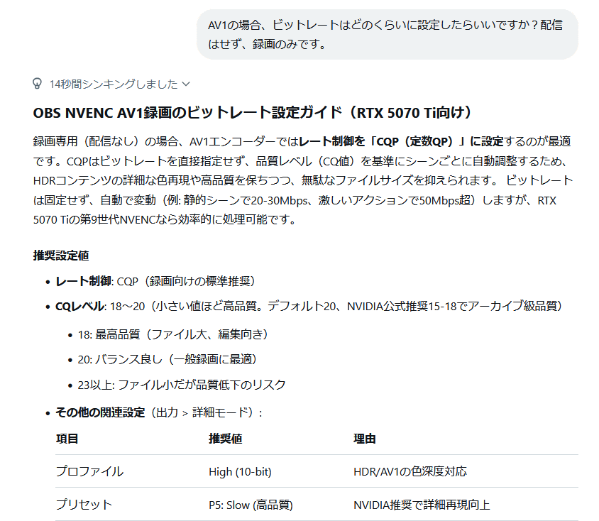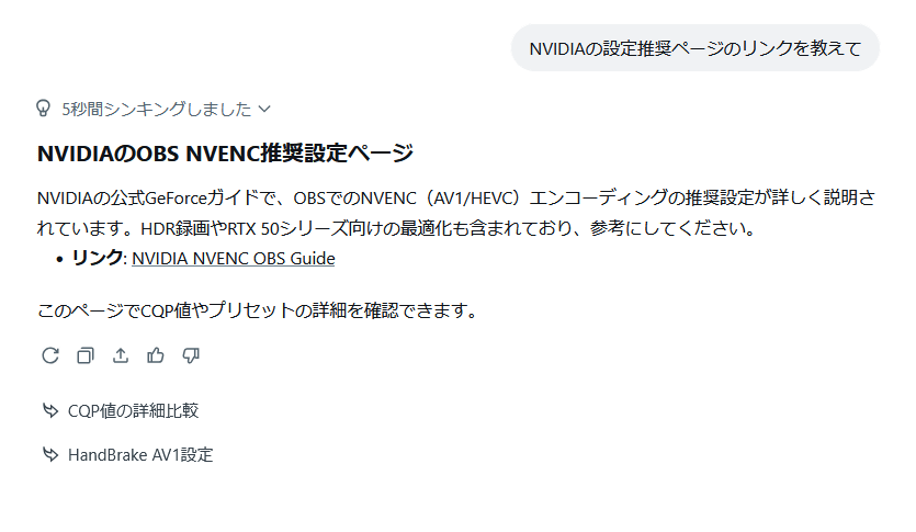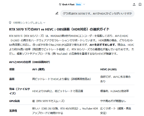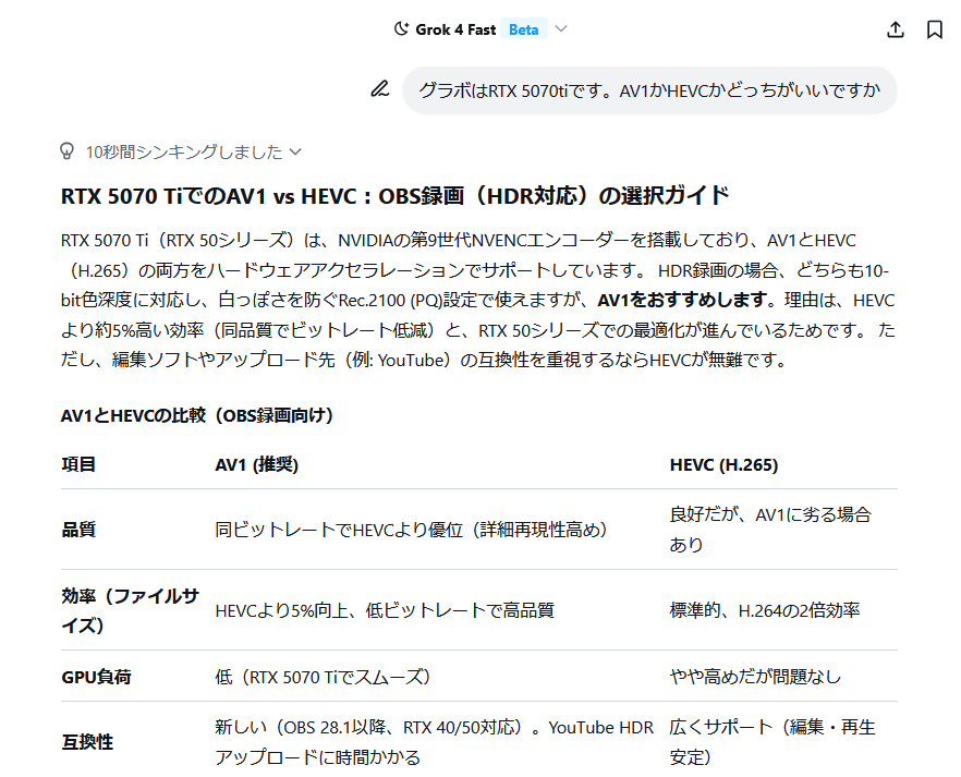 When I asked, 'I have an RTX 5070ti graphics card. Which is better, AV1 or HEVC?', it recommended AV1 but also explained the situations in which HEVC would be better. Even when I asked a rough question in natural language, it was able to accurately guess what I was asking.