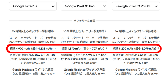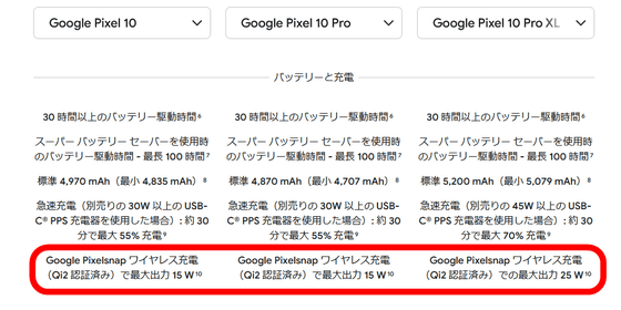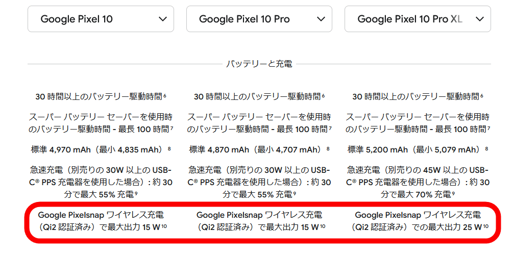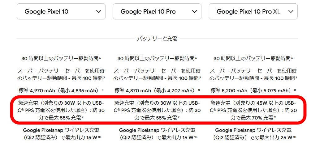 The Pixel 10 series has slightly different wired charging specifications: the Pixel 10 and Pixel 10 Pro support 30W charging, while the Pixel 10 Pro XL supports 45W charging.