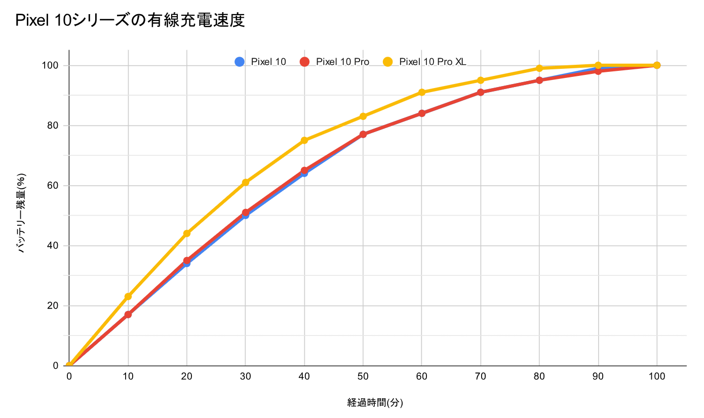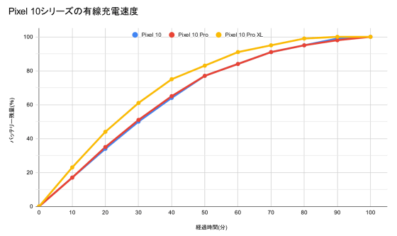 The graph below shows battery life measured every 10 minutes. The Pixel 10 (blue) and Pixel 10 Pro (red) charge at roughly the same speed, with the lines almost overlapping. The Pixel 10 Pro XL (yellow) charges faster than the other two models, reaching 61% after 30 minutes, 91% after 60 minutes, and finally reaching full capacity in 90 minutes.