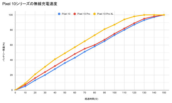 The remaining battery level was recorded every 10 minutes and graphed. After 30 minutes, the Pixel 10 (blue) was at 20% battery, the Pixel 10 Pro (red) was at 24% battery, and the Pixel 10 Pro XL was at 31% battery. The Pixel 10 and Pixel 10 Pro took 150 minutes to fully charge, while the Pixel 10 Pro XL took 130 minutes.