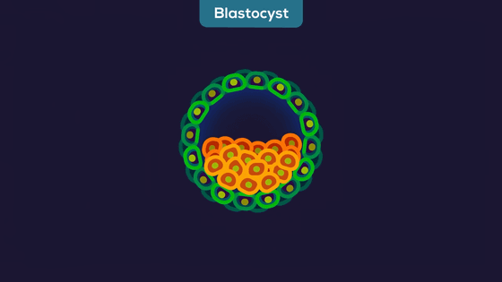 The fertilized egg undergoes cell division to become a blastocyst, which then begins to divide into two separate entities: the inner cell mass (yellow) that will eventually become a baby, and the trophectoderm (green), which will develop into a temporary organ in the mother's womb: the placenta.