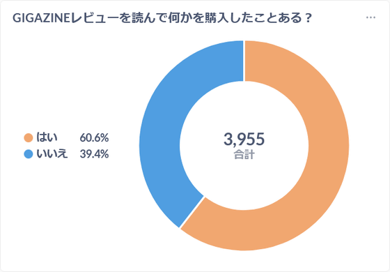 When asked, 'Have you ever read a GIGAZINE review article and been influenced to actually purchase a product or service?', 60.6% of readers answered 'yes,' while 39.4% answered 'no.'