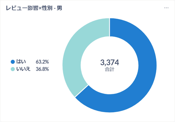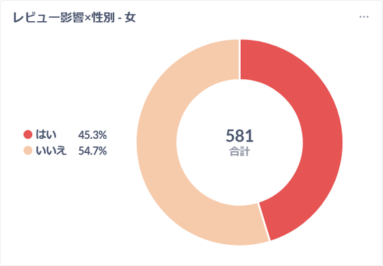 In contrast, the percentage of women was 45.3%, which is significantly lower than the overall average. It's not just that women are less influenced by reviews, but it's also possible that the products and services reviewed on GIGAZINE are too male-oriented (products and services that female readers are not interested in).