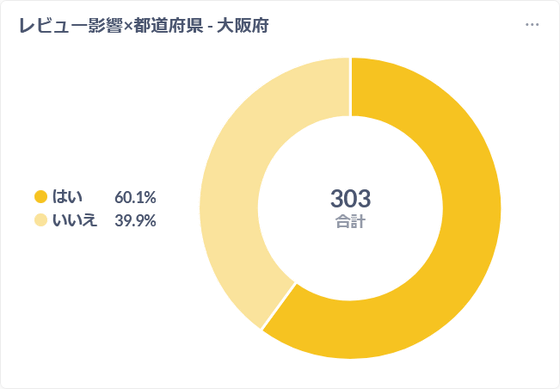 Among the top five prefectures with the most GIGAZINE readers, Osaka Prefecture had the lowest percentage of readers who answered that they had purchased a product or service based on a review article. At 60.1%, this percentage was even lower than the overall average.