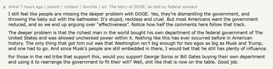 One user pointed out that the fundamental problem with DOGE isn't the reckless and foolish dismantling of government agencies, but that 'the richest man in the world has been able to buy his own department of the United States federal government and exercise unlimited power within it.' He questioned whether DOGE supporters would support George Soros or Bill Gates buying up departments and manipulating the government to their will.