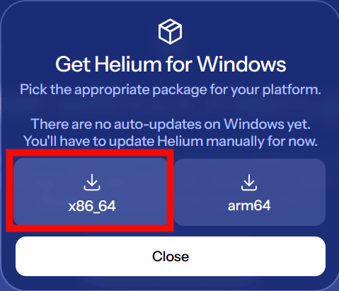 When prompted to 'Select the appropriate package for your platform,' select 'x86_64' and download. Note that Helium does not support automatic updates and must be manually updated to coincide with Chromium updates.