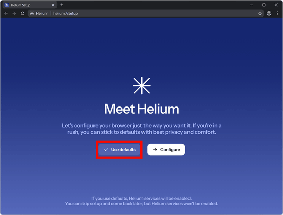 The installation will proceed automatically, and after a while Helium will start. When you first start it, you will be asked to configure privacy settings, so this time I clicked 'Use defaults'. If you want to configure detailed settings, just click 'Configure'.