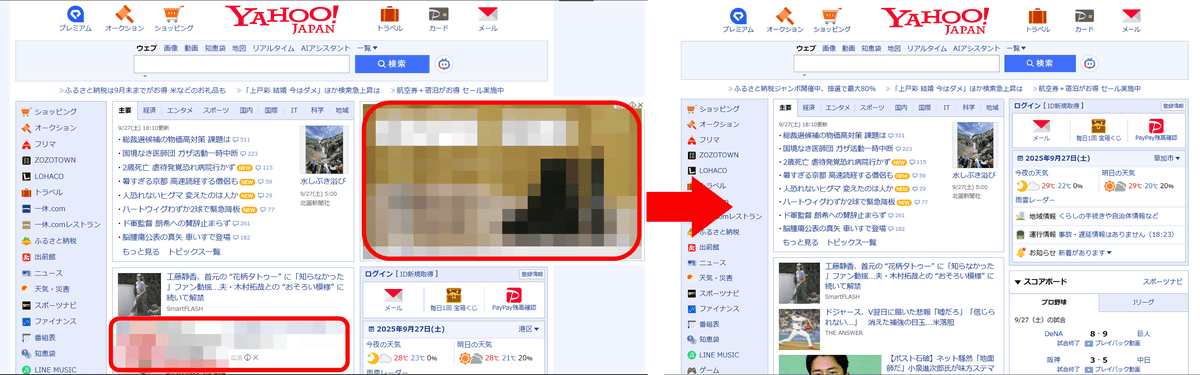 Below, the same portal site is opened in Google Chrome without the extension installed (left) and Helium (right). Google Chrome has a large ad at the top of the site, and there are also ads in the news list, but Helium removes the ads for a cleaner, cleaner experience. Helium comes pre-installed with the ad-blocking extension '