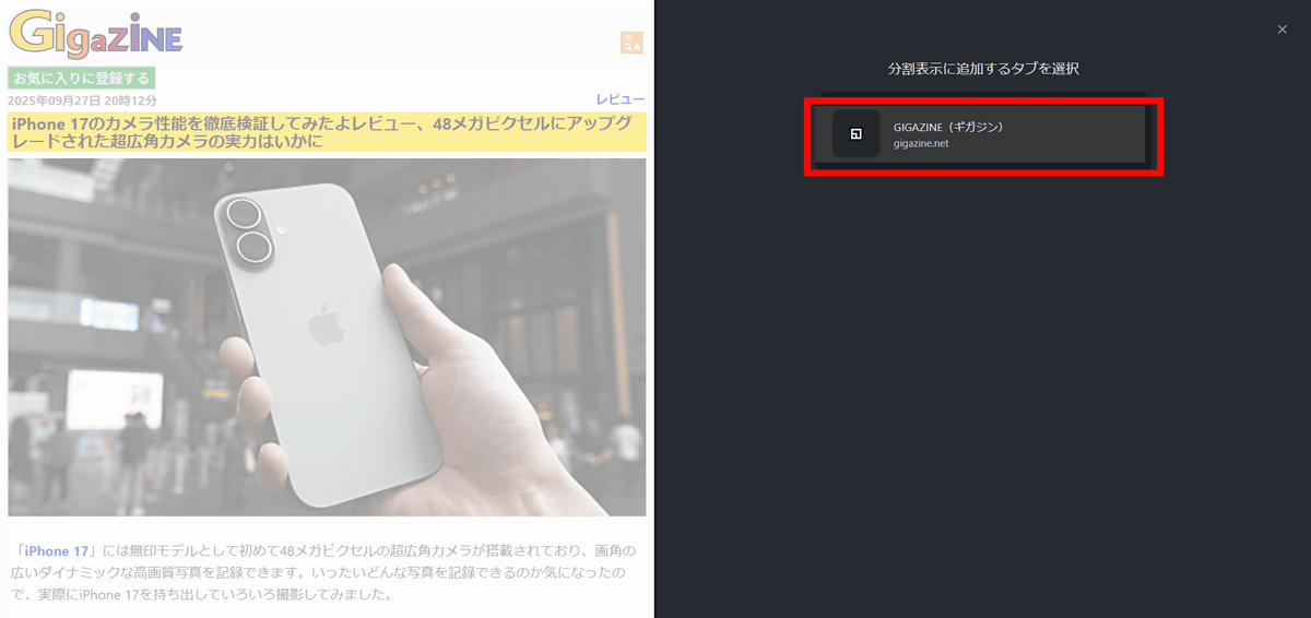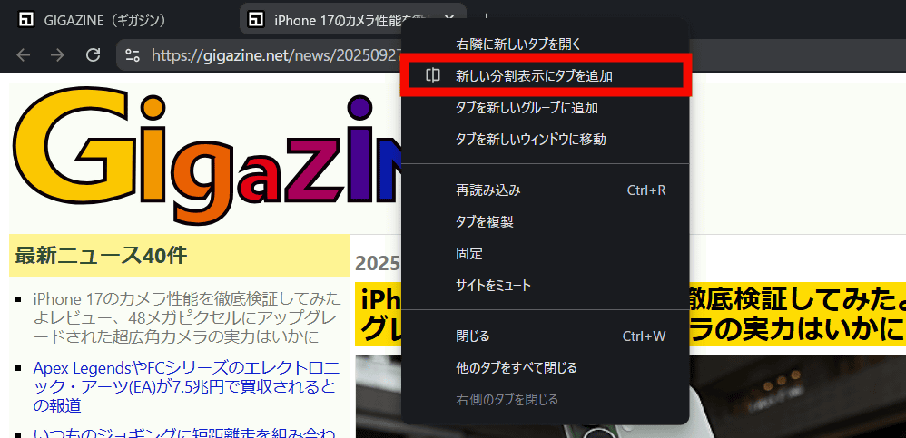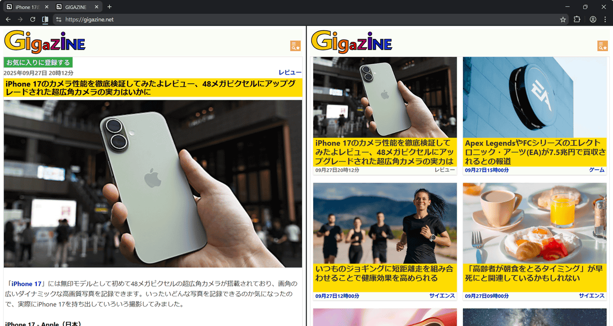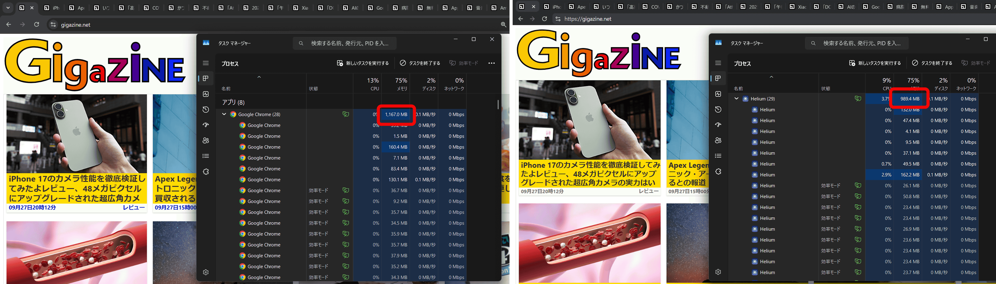Below, Google Chrome (left) and Helium (right) show 20 tabs of the same GIGAZINE article open. Checking the Task Manager in this state, we can see that Helium runs more lightly than Google Chrome. The more tabs you open, the more you'll notice Helium's speed.