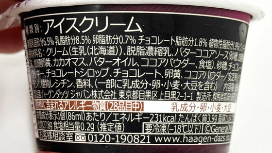 The ingredients include butter cocoa sauce, cocoa mass, cocoa powder, chocolate cookies, etc. Calories are 231 kcal per piece.