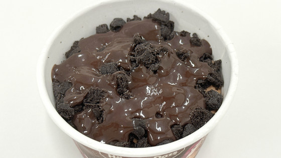 The lid has been opened and the inner lid removed. The top is covered in pitch-black chocolate cookies and cocoa sauce. The 'Devil's Whisper' released in 2022 used milk cocoa sauce, but this time it has been changed to butter cocoa sauce.