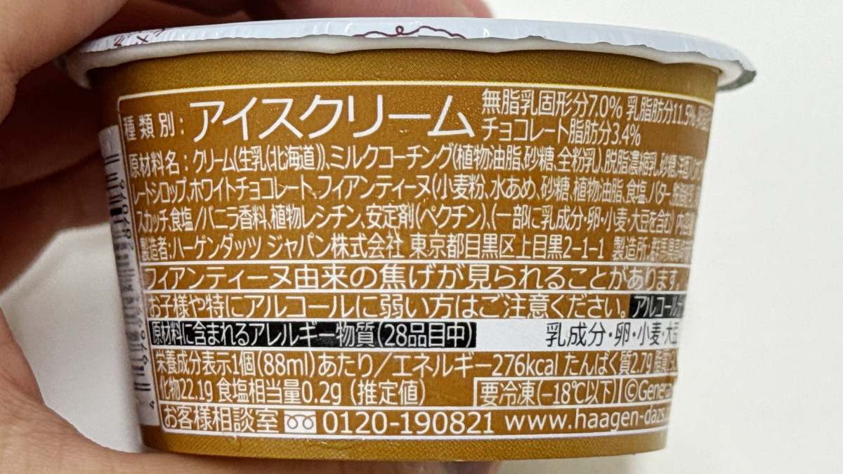 The ingredients include cream, milk coating, white chocolate, liquor, feuilletine, etc. The calorie count was 276 kcal per piece.