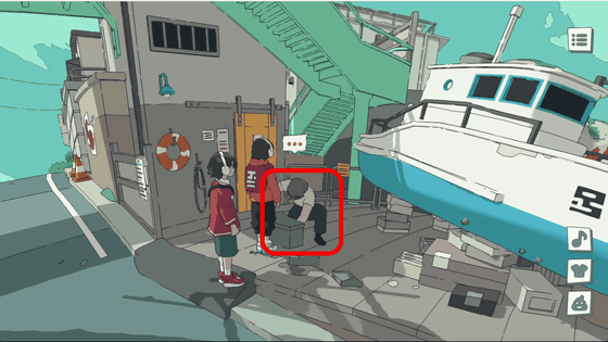 Click on the man examining a suspicious looking box near the ship, right near the starting point.
