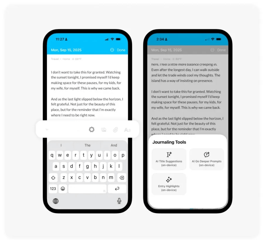 The diary app 'Day One' uses Foundation Models to implement features such as suggesting entry titles and generating prompts based on the diary entries you've written that encourage you to dig deeper.