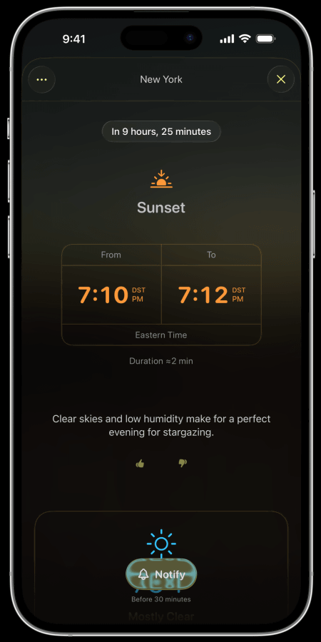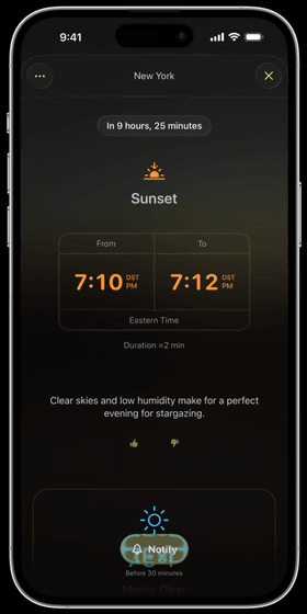 Lumy, which shows you sunrise and sunset times, now offers helpful weather suggestions within the app.