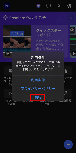 Launch the installed Adobe Premiere. The terms of use will be displayed, so tap 'Continue'.