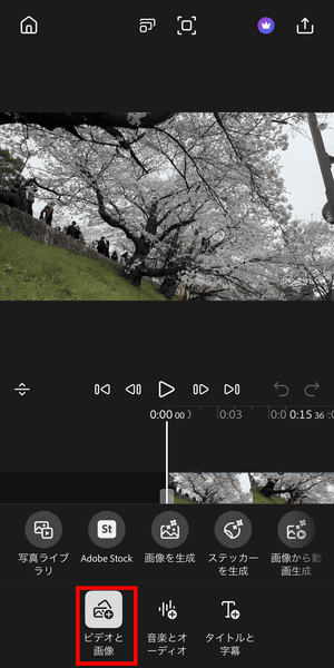 The bottom menu allows you to select the type of video editing you want to do. 'Videos and Images' allows you to add images and videos to the timeline.