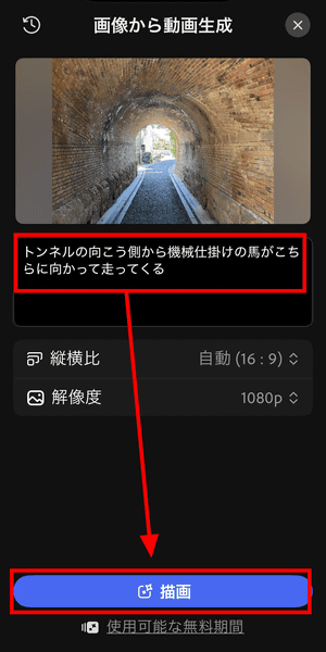 The imported photo shows the view from the other side of a short tunnel. Enter the prompt and tap 'Draw.'