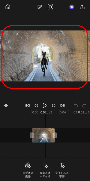 Once the selected video is loaded, it will look like this. The top half of the screen is the preview screen, and the bottom half is the timeline.