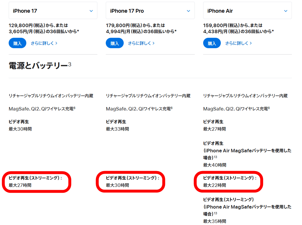 The official battery life for the iPhone 17, iPhone 17 Pro, and iPhone Air is as follows: For video streaming, the iPhone 17 is said to last up to 27 hours, the iPhone 17 Pro up to 30 hours, and the iPhone Air up to 22 hours. However, since the official values were obtained in Apple's testing environment , we will actually measure the battery life at the GIGAZINE editorial department.
