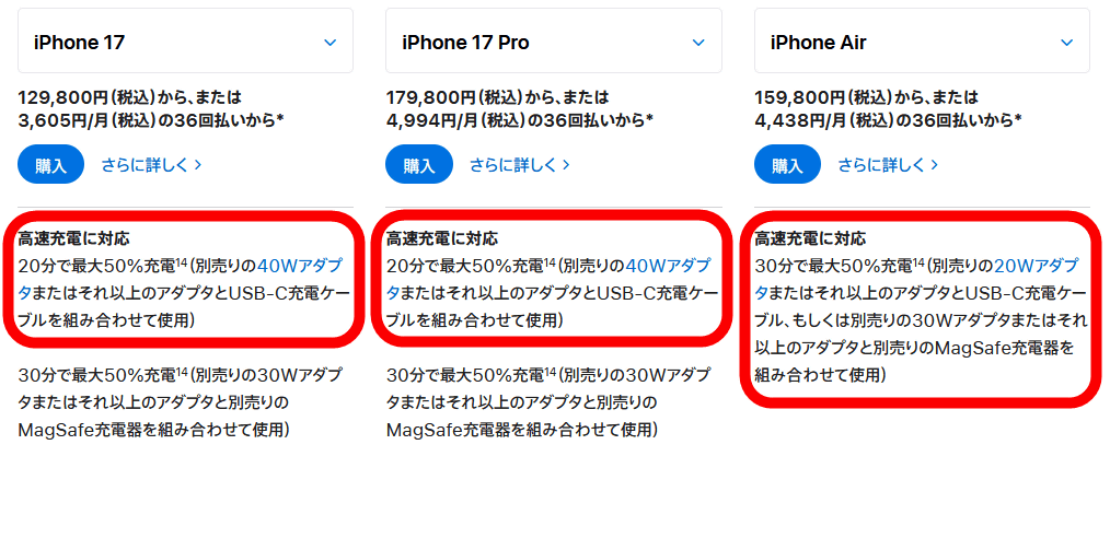 Looking at the official specs, the iPhone 17 and iPhone 17 Pro can be charged up to 50% in 20 minutes using a 40W charging adapter, while the iPhone Air can be charged up to 50% in 30 minutes using a 20W charging adapter, showing the difference in charging performance.