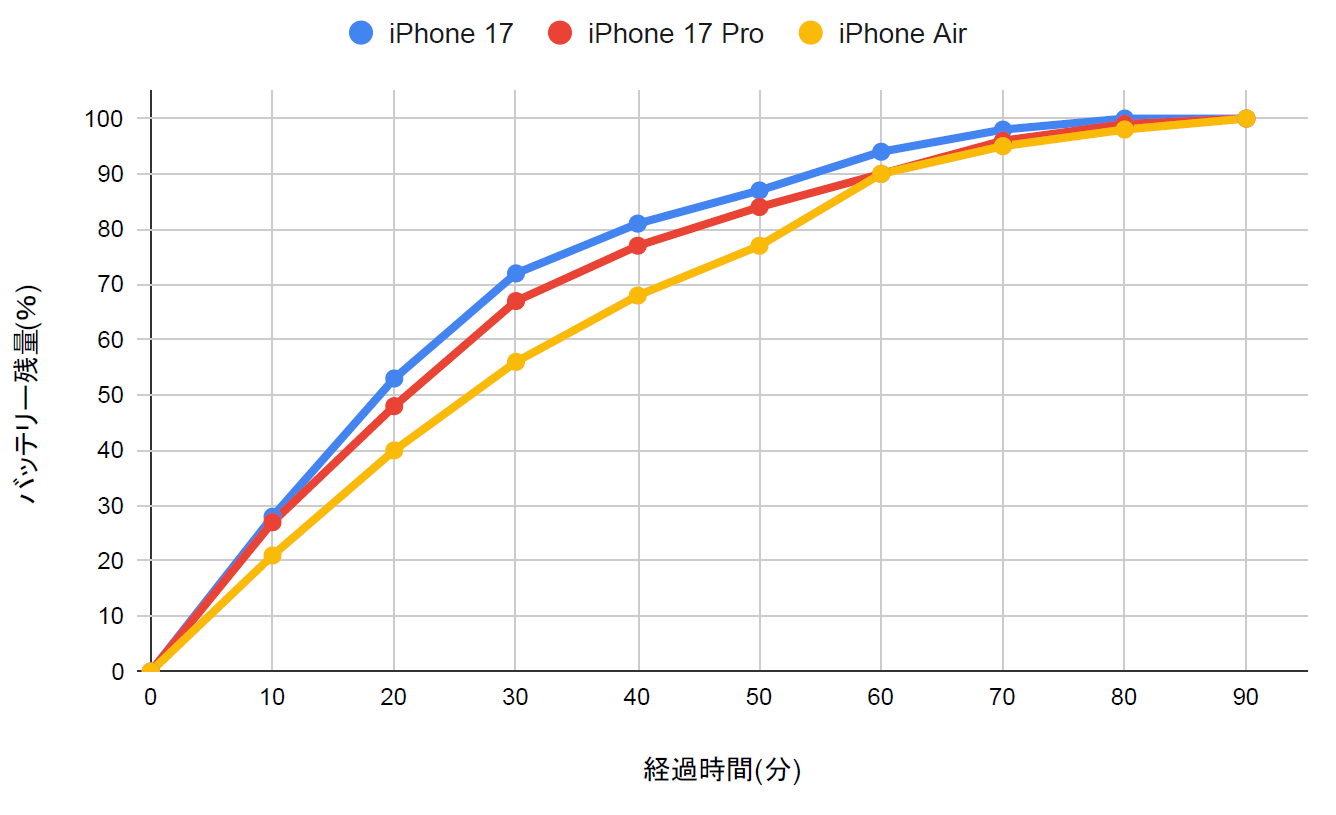 The graph below shows the remaining battery life recorded every 10 minutes. After 30 minutes, the iPhone 17 was at 72%, the iPhone 17 Pro was at 67%, and the iPhone Air was at 56%. The iPhone 17 then took 90 minutes to fully charge, while the iPhone 17 Pro and iPhone Air took 100 minutes.