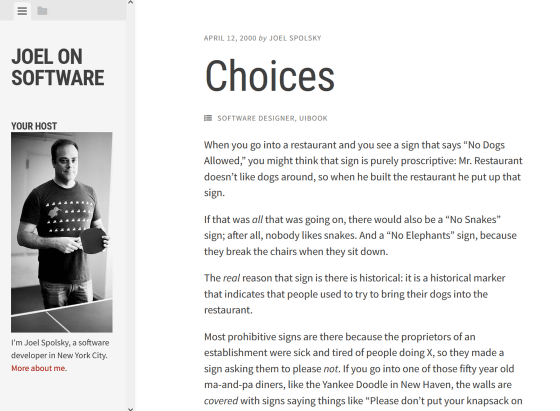 'Joel's essay focuses on the graphical user interface, but I think about it everywhere people might touch my code, whether it's the command line or when other developers call the functions I've written,' Lynch said. 'Joel's essay has helped me countless times to avoid forcing decisions on users that they could make for themselves.'