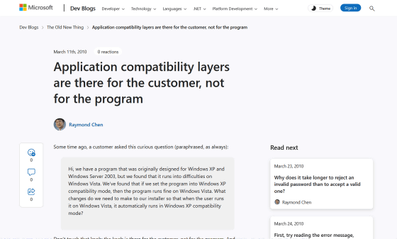 Raymond Chen is one of the longest-serving developers on the Microsoft Windows team, and his blog has many informative articles about the history of programming on Windows. Lynch particularly remembers this article about Windows Vista compatibility mode.