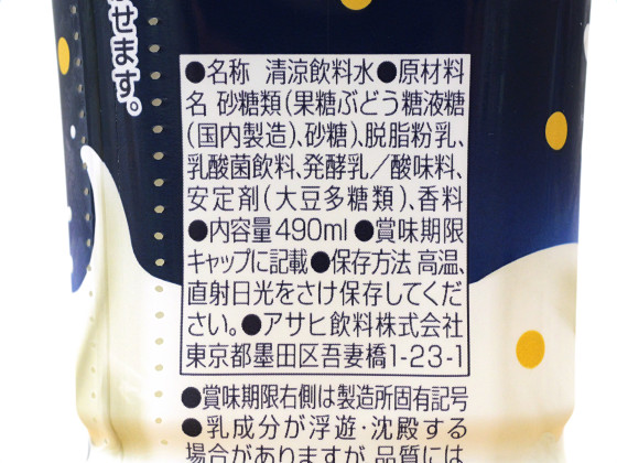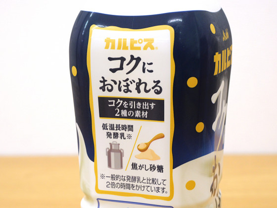 The side of the label highlights that it uses 'low-temperature, long-term fermented milk' and 'burnt sugar.'