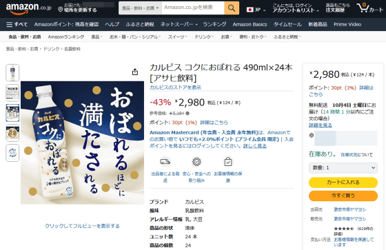 The suggested retail price of 'Calpis Rich' is 216 yen including tax. At the time of writing, 24 bottles can be purchased at Amazon.co.jp for 2,980 yen including tax (124 yen per bottle).