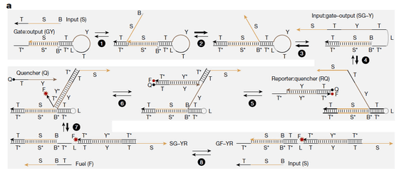 This technology involves designing specific DNA strands into a folded structure called a 'hairpin,' creating a state of stored energy called a 'dynamic trap.' When another DNA strand is added from the outside as an 'input,' this hairpin structure unwinds and the calculation is performed. After the calculation is completed, the circuit is heated to around 95°C, and all the DNA bonds are released, returning to a single-stranded state.