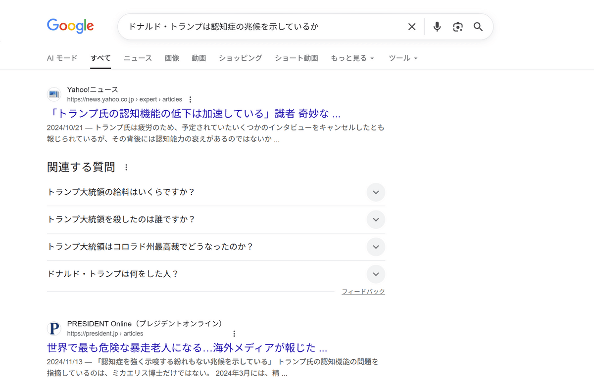 A Google search for the words 'Is Donald Trump showing signs of dementia?' revealed no AI summary.