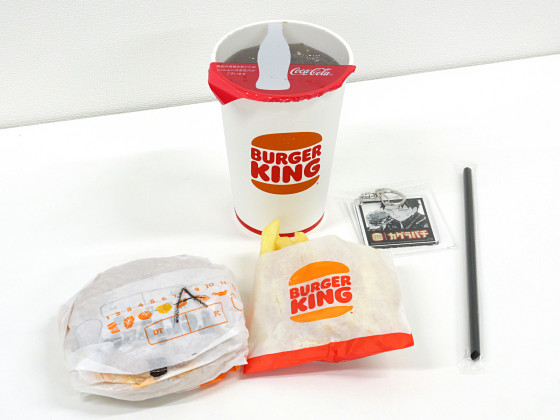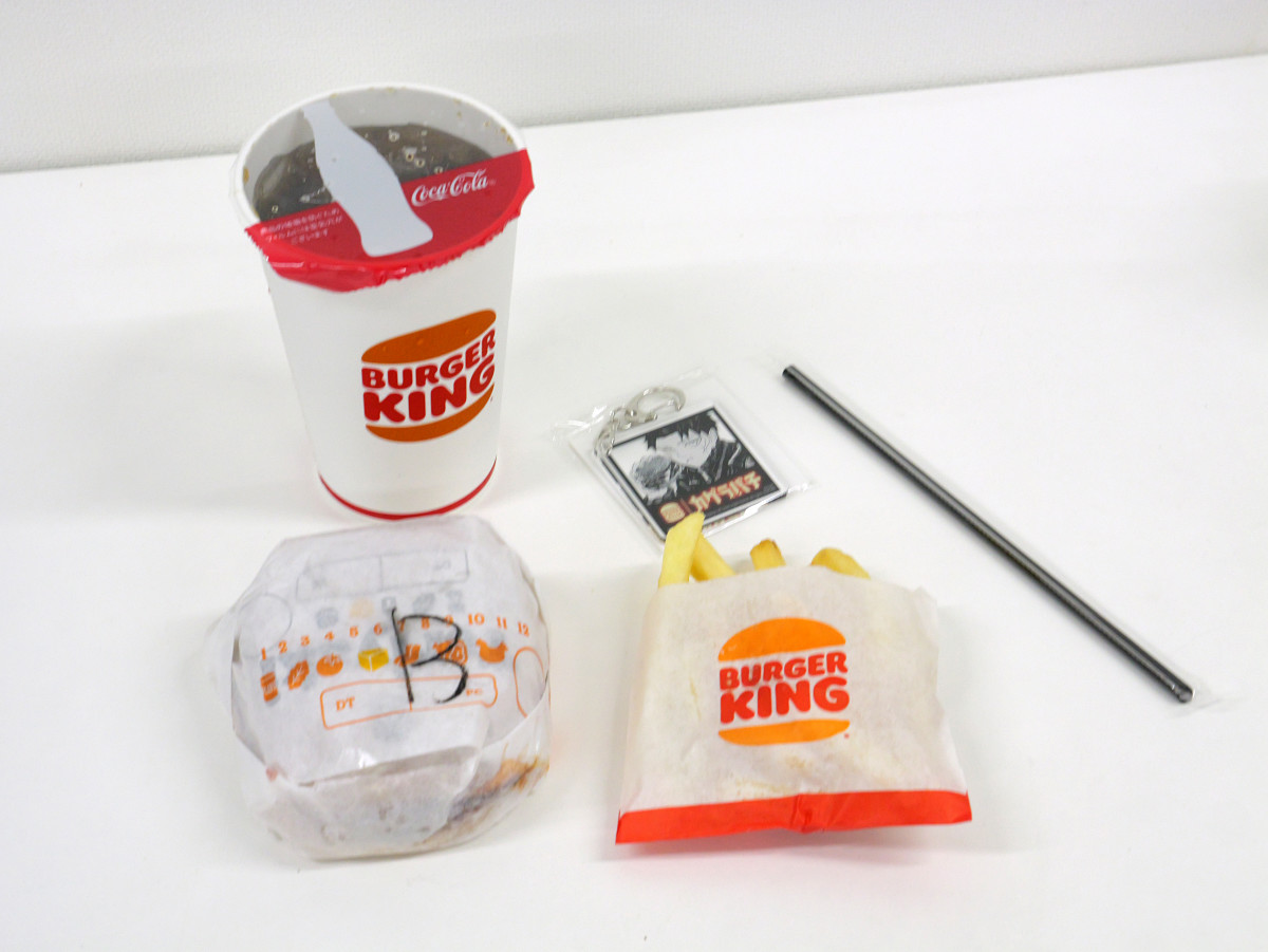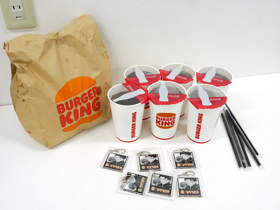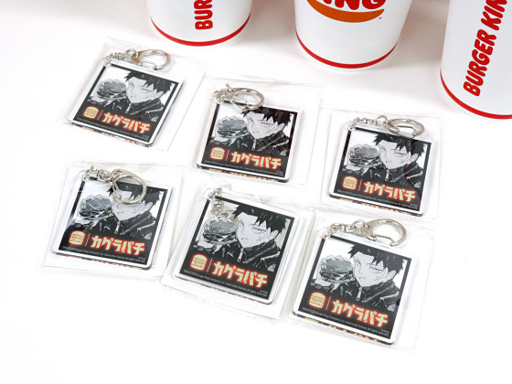 There are three types of acrylic keychains: 'Rokuhei Chiko,' 'Kakari Hiyuki,' and 'Sazanami Hakuri,' but only one type can be obtained at each store. At the Burger King I went to this time, I was able to get the 'Rokuhei Chiko' acrylic keychain.
