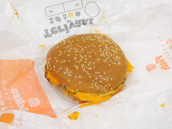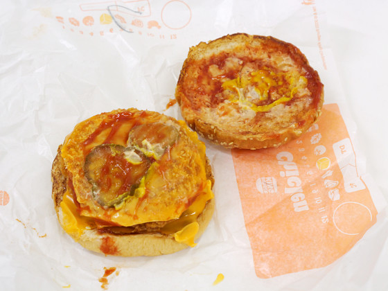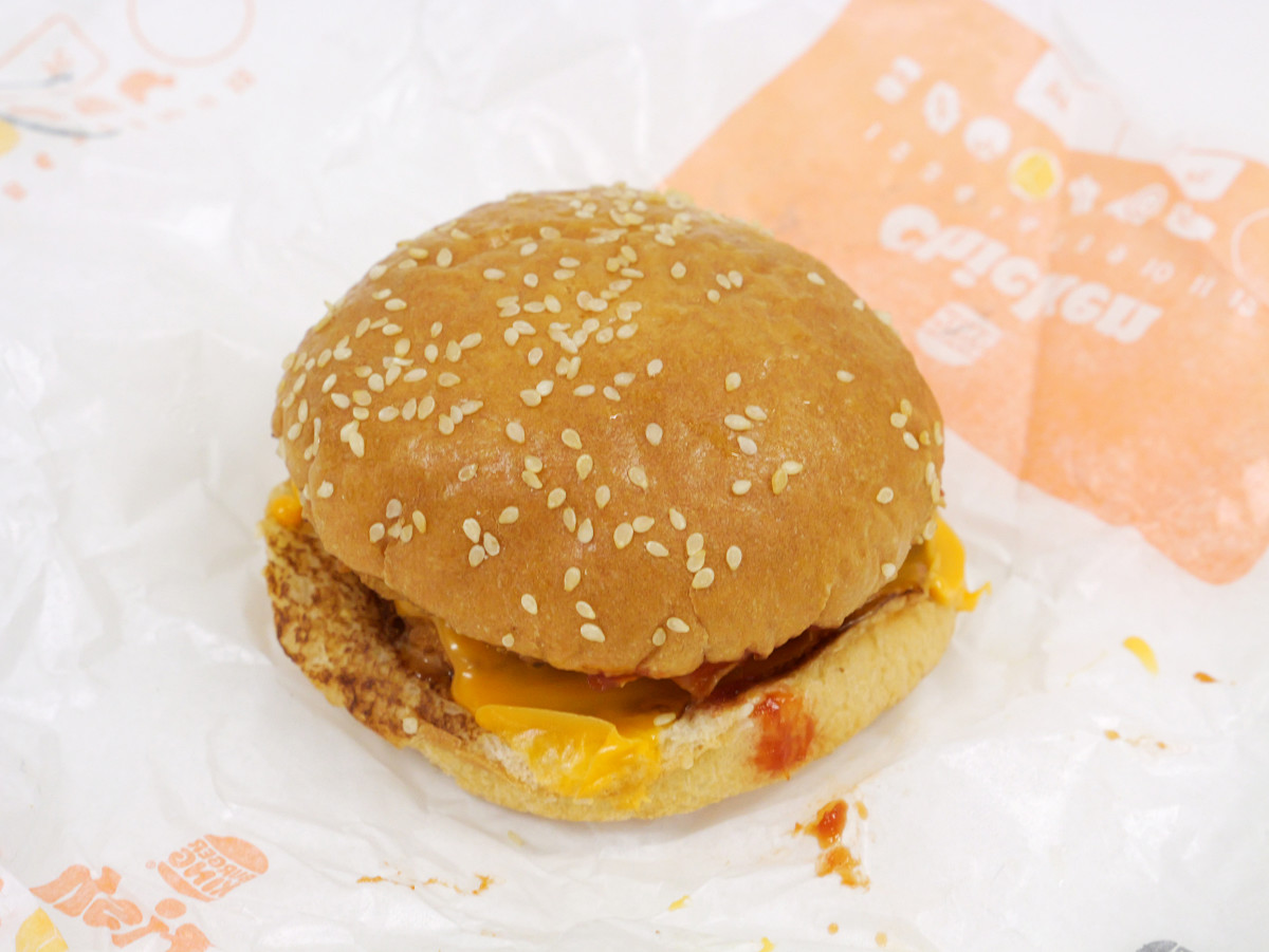 The chicken patty is quite thick, making for a hearty burger. The crunchy batter is also great. However, it has a stronger salty taste than beef patty burgers, so we recommend eating it with a drink like cola.