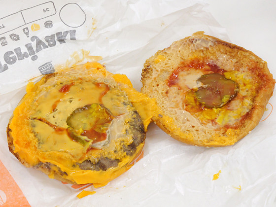When you eat it, the smoky flavor is quite noticeable. The two beef patties and cheese are also very prominent, and the overall flavor is quite strong. The pickles give it a refreshing aftertaste, so you can keep eating it despite its strong flavor.