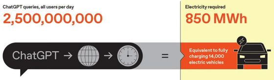 OpenAI claims that ChatGPT serves 700 million weekly users and processes 2.5 billion queries per day. Assuming an average query consumes approximately 0.34 Wh, ChatGPT consumes 850 MWh of electricity per day across all users, equivalent to enough power to charge 14,000 electric vehicles.