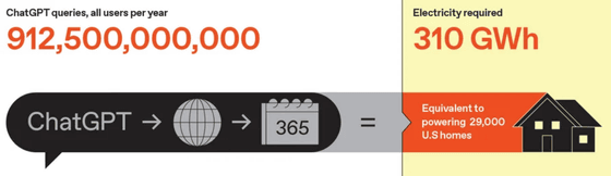 Furthermore, 2.5 billion queries per day translates to approximately 900 billion queries per year, and if ChatGPT's user base continues to grow, it is likely to exceed 1 trillion queries per year. Using the same formula to calculate annual energy consumption, ChatGPT's annual consumption is estimated to be 310 GWh, equivalent to the annual electricity supply of approximately 29,000 American households.