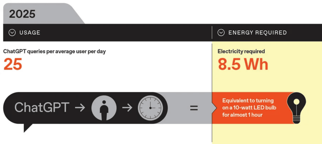Additionally, OpenAI CEO Sam Altman stated in a blog post in June 2025 that the average ChatGPT query would require approximately 0.34Wh of power, roughly the same as the power consumed by an oven in just over one second. OpenAI usage statistics calculated that an average user would make 25 queries per day, meaning each user would consume 8.5Wh of power per day.