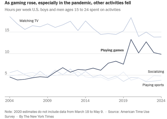 the ATUS , a large-scale survey of what Americans spend their time on, for American men aged 15 to 24. The data, from 2004 to 2024, shows that while time spent watching TV, playing sports, and socializing has decreased, time spent playing games has increased significantly since the COVID-19 pandemic.