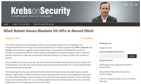 The Aisuru botnet unleashed a record-breaking 30 Tbps (30 trillion bits per second) DDoS attack. According to security expert Brian Krebs, much of the attack power came from an estimated 300,000 hacked IoT devices hosted by US ISPs like AT&T, Comcast, and Verizon.