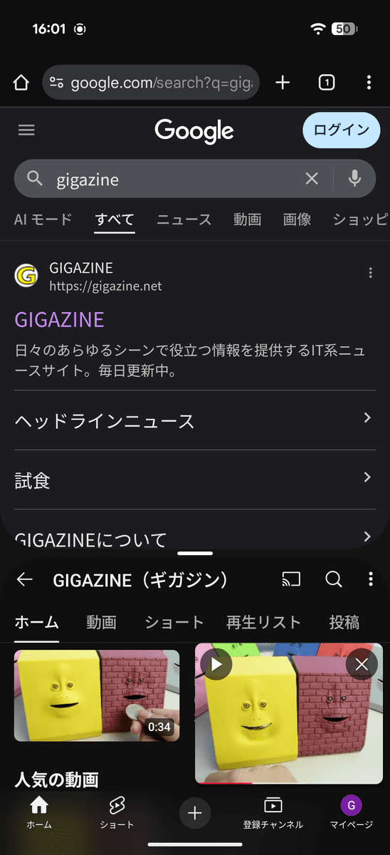 I thought I could use it to play games on one screen and watch YouTube on the other, so I tried it, but when I used an app other than YouTube in split screen mode, it seemed to detect YouTube as being in the background, so with YouTube's free plan, background playback was not possible and playback was paused.