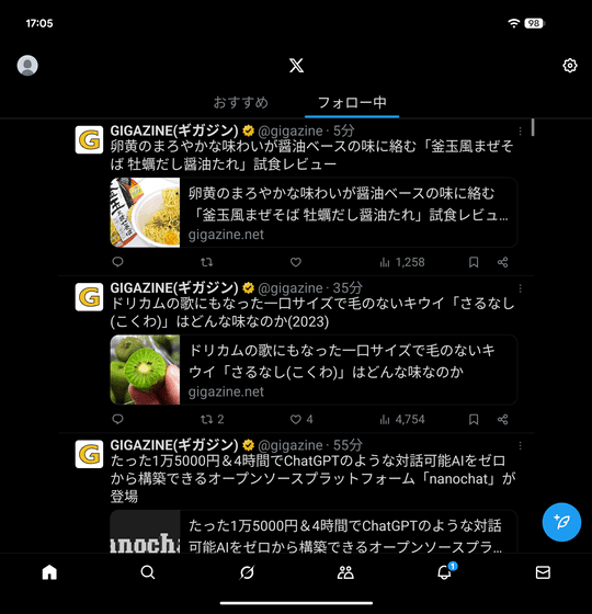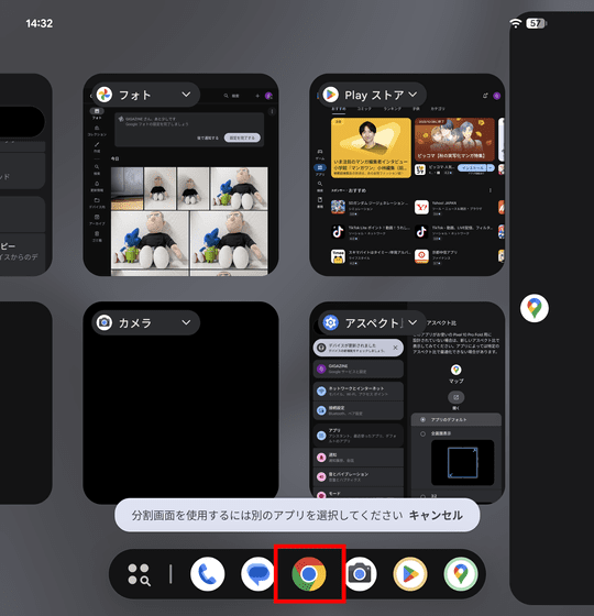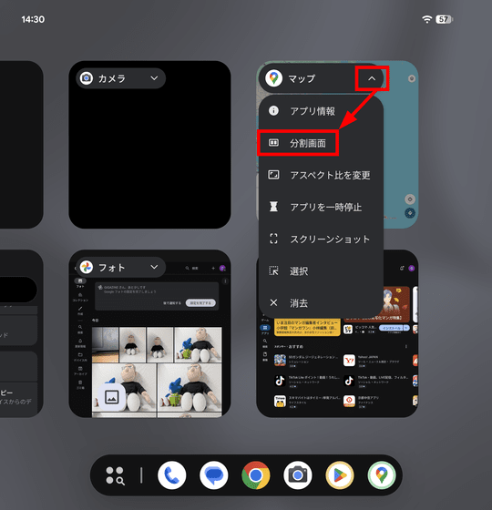 Let's try it out. With the default screen operation mode 'Gesture Navigation' enabled, slowly swipe up from the bottom of the screen to open the task screen.
