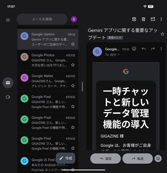 Being a foldable smartphone that makes effective use of two screens, it feels like using a tablet. For example, in the Gmail app, you can display an email thread on the left screen and view emails on the right screen.