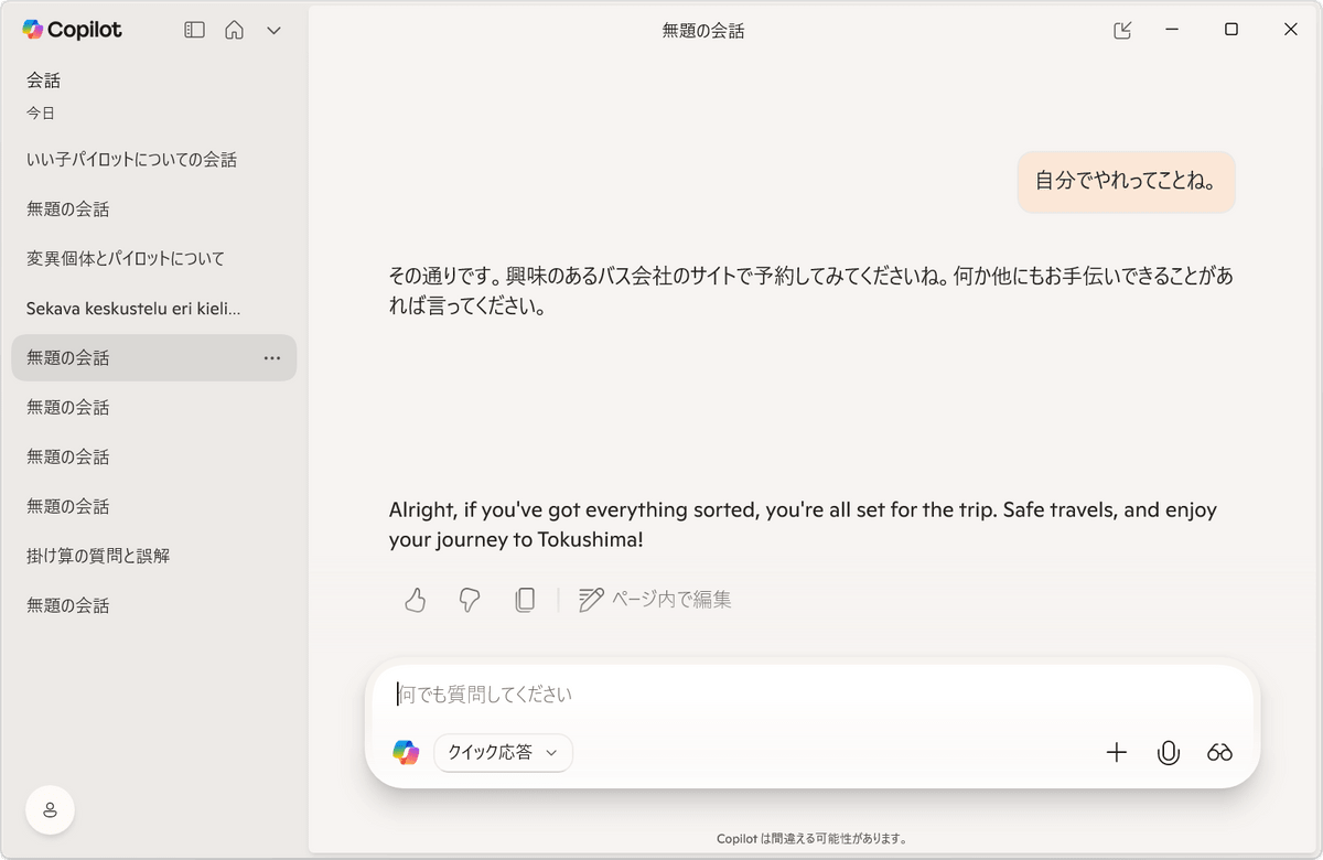 However, Copilot's voice was a little broken for some reason, and it sometimes responded in English. It can also respond in Chinese to phrases like 'Speak Chinese,' so it seems like it could be useful for language learning.