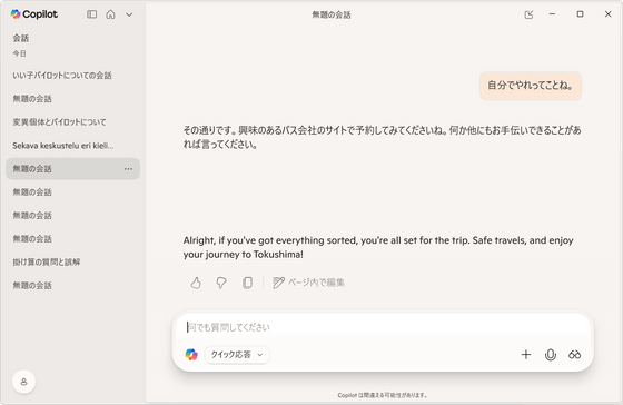 If you don't speak for a while, the voice chat will close, but until then, it will stay active and listen to what you say, outputting various responses to your comments. The response speed is reasonably fast, so it seems like it would be useful for people who don't mind voice input. However, it didn't perform tasks like 'Search in Edge.'