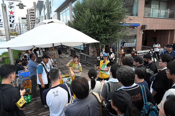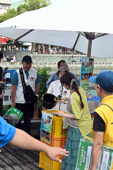 One of the stages, near Shinmachibashi Higashi Park, was a parasol pool with baskets and sudachi citrus fruits. Attached to the baskets was a message that read, 'Your handful will help support the NPO's activities and the future of the sudachi fields!'