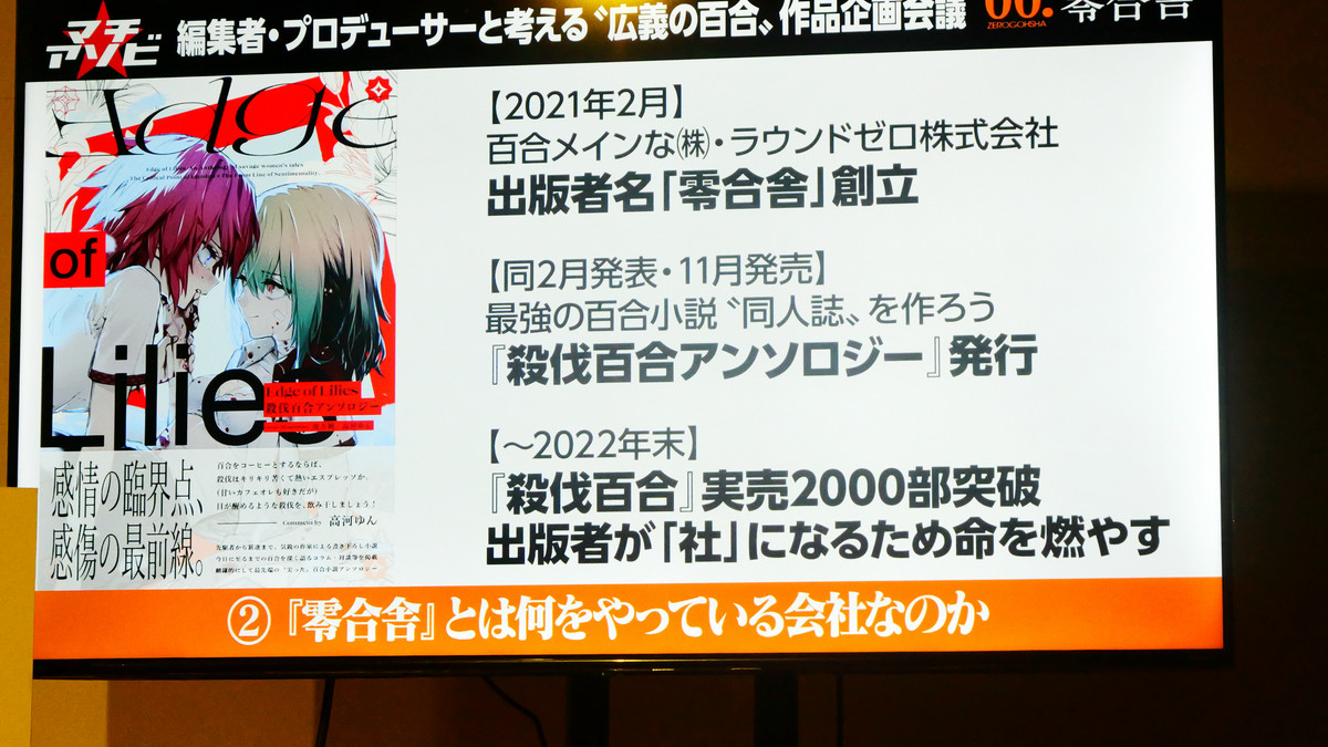 And here's the story behind this event. Reigousha was founded in February 2021, and published the brutal yuri anthology 'Edge of Lilies' in November of the same year. The magazine, which claims to be about 'the critical point of emotions, the forefront of emotions,' is a yuri-themed anthology that depicts 'raw emotions that are not just love, but also murderous intent and hatred, intertwined between two people,' and has sold over 2,000 copies. Reigousha is the publisher , after all.